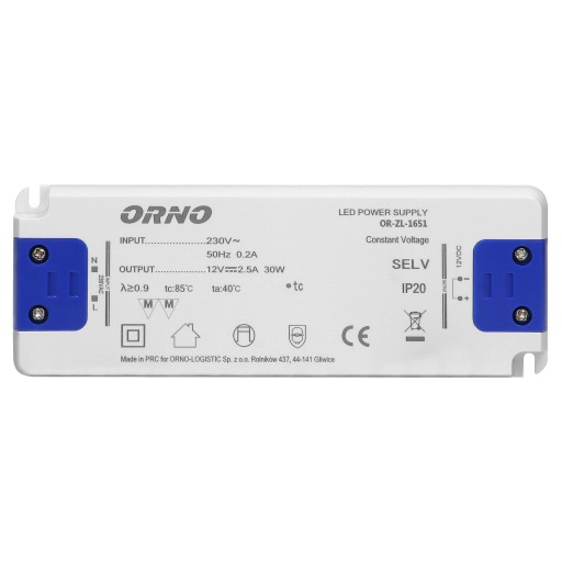 Zasilacz płaski o napięciu 12V DC i maksymalnym obciążeniu 30W. Służy do zasilania oświetlenia LED, w suchym otoczeniu. Obudowa wykonana została z tworzywa sztucznego. Zasilacz posiada wejściowe i wyjściowe zaciski przyłączeniowe. Sprzedawany jest bez okablowania. Wysokość 18mm.