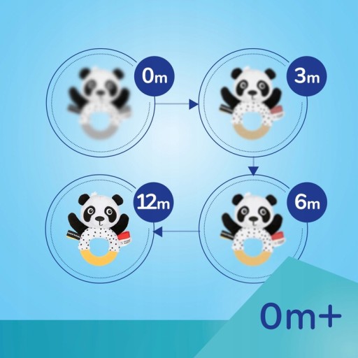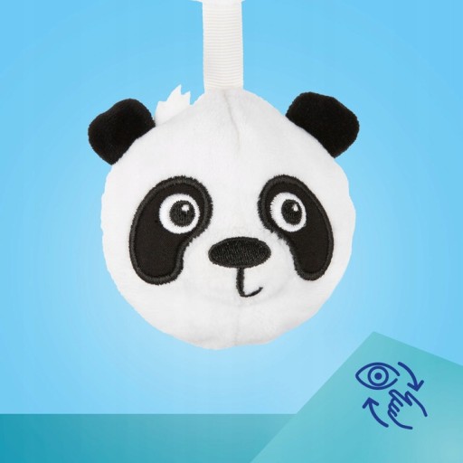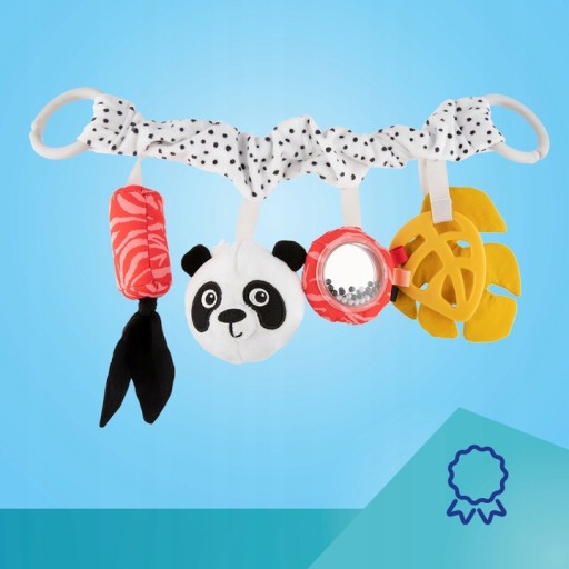 Subtelna, ale kontrastowa kolorystyka, zachęci dziecko do chwytania i zabawy. Każdy z elementów zawieszki posiada inną funkcję – dzwoneczek z kokardką wydobywa delikatne dźwięki, miękka pluszowa panda, wykonana z przyjemnego w dotyku i miękkiego materiału, zachowuje kształt przy ściskaniu, lusterko otoczone kolorowymi metkami z grzechotką oraz dwa listki – jeden przyjemnie szeleści, a drugi w formie gryzaka przyniesie ulgę podczas ząbkowania.