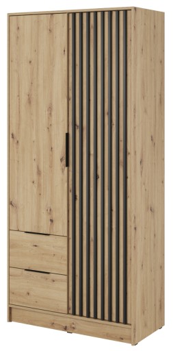 Nelly_2D - 105 x 200 x 51– dwudrzwiowa szafa składa się z dwóch części, po prawej stronie umieszczono front na całą wysokość szafy, za którym znajdują się cztery półki, po lewej stronie umieszczono nieco krótszy front z drążkiem na wieszaki, a pod nim dwie szuflady.