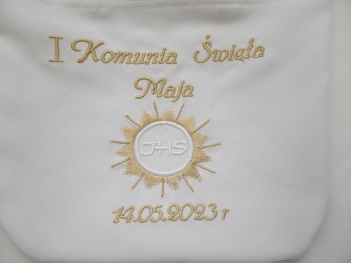 - Na torebce umieszczony jest napis I KOMUNIA ŚWIĘTA imię i data komunii