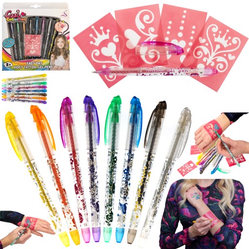W zestawie znajduje się 8 pachnących pisaków żelowych do tworzenia tymczasowych tatuaży: