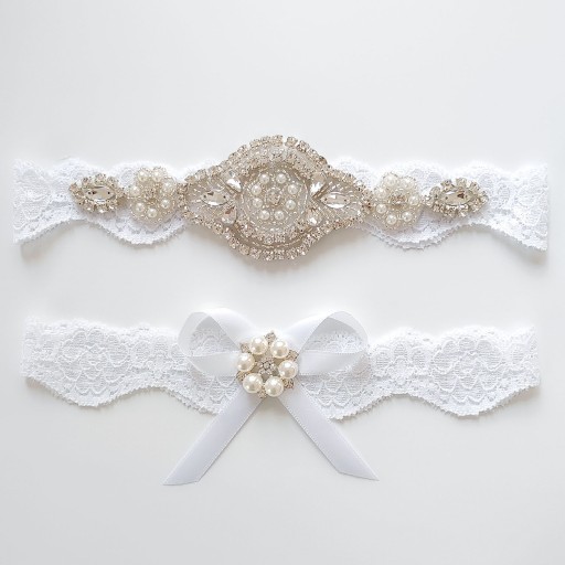 Wyjątkowe i unikatowe białe podwiązki ślubne bogato zdobione kryształami i perełkami. Komplet dwóch podwiązek.