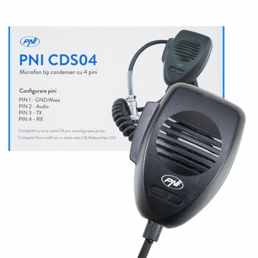 4-pinowy mikrofon elektretowy Mikrofon elektretowy PNI CDS04, w solidnej i wytrzymałej obudowie, ma kabel chroniony wzmocnieniem typu Kevlar, aby zwiększyć odporność na zużycie. Złącze ma 4 piny i jest kompatybilne z każdą stacją CB poprzez rekonfigurację pinów i stacji Midland Alan 100 bez żadnych modyfikacji.