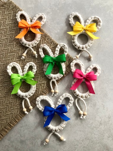 Każdy zając wykonany jest z drewnianej obręczy o średnicy 55 mm, w 100% bawełnianego sznurka, dwóch drewnianych koralików i cudownej kolorowej wstążki rypsowej.