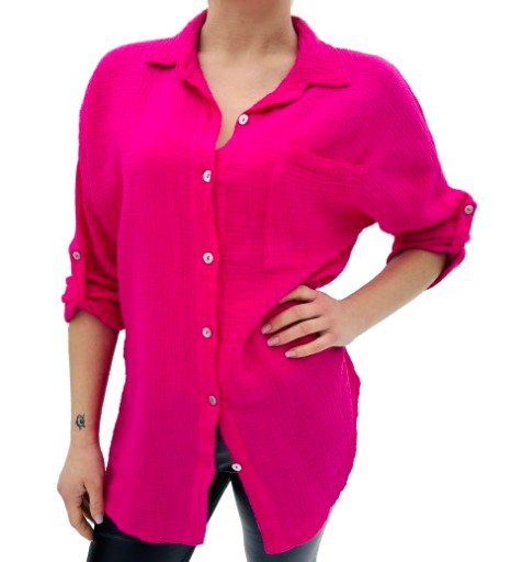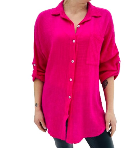 Koszula z długim rękawem, zapinana po całości na guziki. Idealna propozycja na nadchodzący sezon, wykonana z przewiewnego materiału dzięki czemu zapewnia komfort noszenia. Idealna także na kostium kąpielowy .Prosty/oversizowy fason sprawdzi się w wielu stylizacjach. Dostępna w kilku wariantach kolorystycznych!