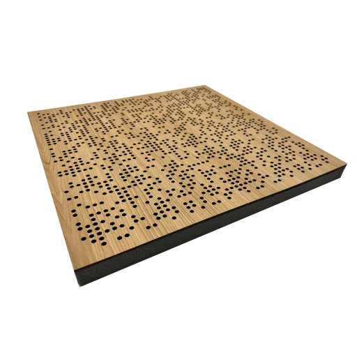 Dzięki połączeniu atestowanej gęstej pianki akustycznej o strukturze porów otwartych oraz płyty pokrytej fornirem naturalnym z odpowiednio dobraną perforacją.