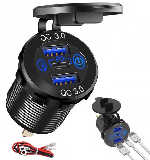 Gniazdo USB 12 V dual QC 3.0 Pojedynczy port USB o maksymalnej mocy 36 W, całkowita moc jednego portu 30 W (pojedyncze wyjście 18 W, dwa inteligentne wyjścia 30 W). Maksymalna moc wyjściowa pojedynczego portu PD TYPE C wynosi 24W.