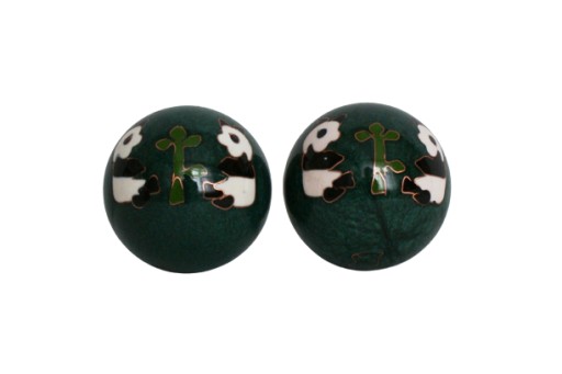 - 2 zielone kule grające w pandy z bambusem o średnicy dochodzącej do 5 cm,