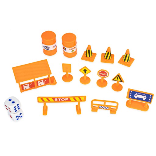W środku znajdują się nie tylko resoraki, ale także elementy interaktywne takie jak znaki drogowe, kostki do gry oraz gra planszowa.