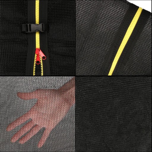 Siatka do trampoliny posiada zapięcie zarówno na zamek błyskawiczny oraz klamrę, która zabezpiecza go przed nieplanowanym rozsunięciem się. Dzięki zastosowaniu tych dwój elementów zwiększone zostało bezpieczeństwo w trakcie użytkowania trampoliny z siatką Springos®.