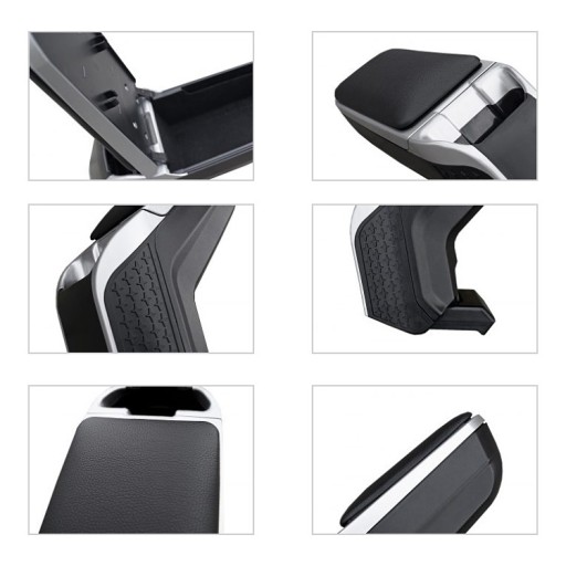 Podłokietnik jest wykonany z tworzywa ABS wysokiej jakości. Oparcie wysuwa się do przodu w pozycji poziomej ok. 5 cm. Podłokietnik posiada na końcu wnękę na przedmioty oraz dodatkowo praktyczny otwierany schowek, wykończony czarnym, miękkim flokiem. W schowku tym znajdują się min. uchwyty na długopisy oraz specjalne miejsce na monety. Cały podłokietnik można odchylić do pionu (podnieść do góry).
