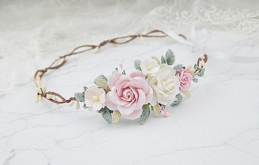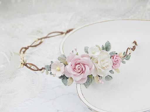 zdobiony delikatnymi kwiatami z dodatkiem zielonych gałązek. Wianuszek regulowany, wiązany z tyłu tasiemką.