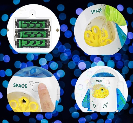 Zabawka pozwala na puszczanie kolorowych baniek mydlanych z automatu. Wystarczy: