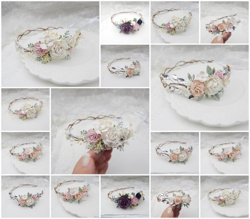 zdobiony delikatnymi kwiatami z dodatkiem zielonych gałązek. Wianuszek regulowany, wiązany z tyłu tasiemką.