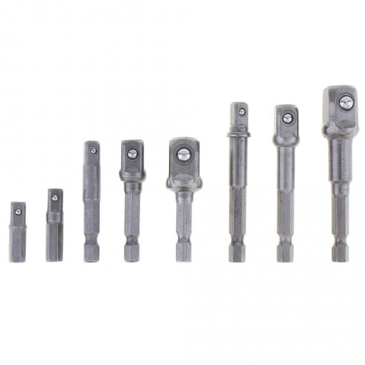 Zestaw 8 specjalistycznych redukcji, adapterów do wkrętarki. Redukcje pozwalają na pracę wkrętarką z nasadkami. Elementy zestawu wykonane są ze stali narzędziowej, która gwarantuje ich wytrzymałość i długą żywotność.