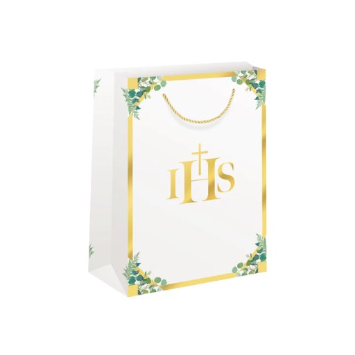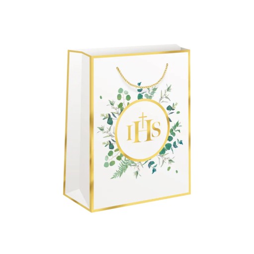 Torebki na prezenty komunijne wyróżniają się tradycyjną elegancją, podkreśloną zwłaszcza przez złote paski na brzegach i inne złote elementy, w tym napis IHS. Przytłumiona biel tła, wiosenna świeżość zielonych gałązek eukaliptusa oraz złote uchwyty z eleganckiego sznureczka, składają się na wyjątkowy wygląd tych torebek prezentowych.
