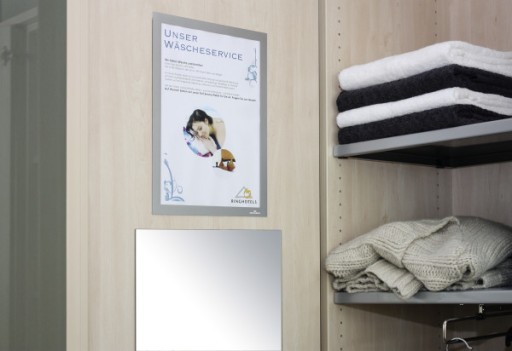- Przy umieszczeniu na szklanej powierzchni informacja widoczna z obu stron dzięki możliwości umieszczenia 2 wkładów.
