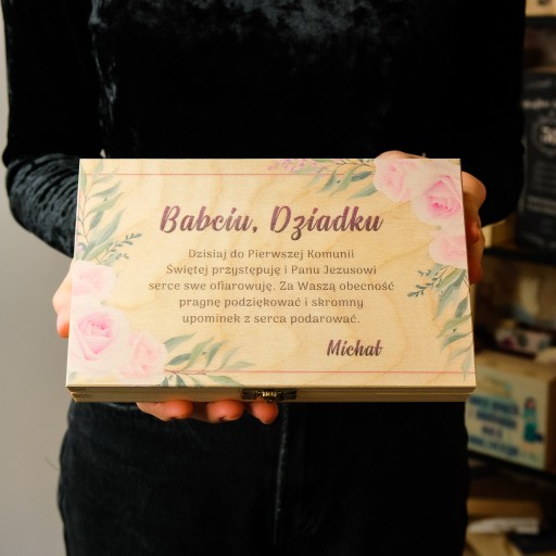 W pudełku możesz umieścić czekoladę, pieniądze, różaniec, medalik lu inn drobiazg który chcesz podarować dziecku!