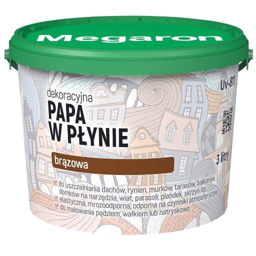 Dekoracyjna Papa w Płynie Megaron jest elastycznym materiałem powłokowym, służącym do zabezpieczania zewnętrznych powierzchni. Papę można zastosować zarówno w celu ochronnym, jak i dekoracyjnym. Pod względem chemicznym stanowi mieszankę surowców mineralnych, dyspersji polimerowej, chemicznych dodatków modyfikujących i wody, o konsystencji gęstej, jednorodnej. Elastyczność oraz wytrzymałość na kontakt z wodą zapewnia wysoką odporność powłoki bez względu na warunki atmosferyczne.