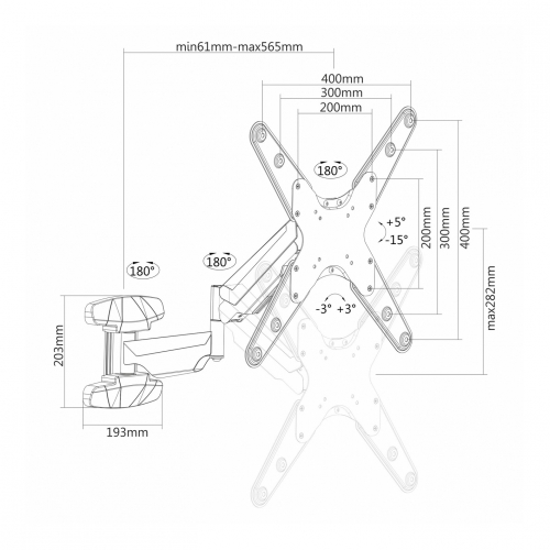 - Standard VESA: 200x200 mm; 300x300 mm; 400x300 mm; 400x400 mm; 200x100 mm; 75x75 mm; 100x100 mm;