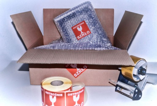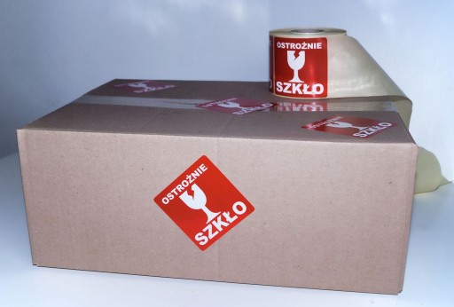 ✅ Po zaklejeniu pudełka karton jest dodatkowo oznaczany naklejkami ostrzegawczymi dla kurierów.