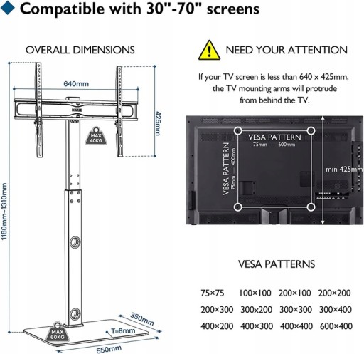 - Kompatybilność - Nadaje się do telewizora o przekątnej od 30 do 70 cali o maksymalnej nośności 40 kg; Zgodny z wzorami VESA 75x75/100x100/200x100/200x200/200x300/300x300/300x400/400x200/400x300/400x400/600x400mm; Zgodne marki telewizorów takie jak Samsung, LG, Sony, Panasonic, Toshiba, Sharp, Mitsubishi, Sanyo, JVC, Logik, Digihome, Technika LCD LED OLED QLED telewizory plazmowe