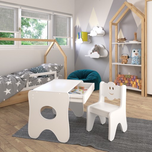 Stolik i krzesełko dla dziecka – oryginalny styl w dziecięcym wnętrzu. Meble dla dzieci zaprojektowane z myślą o bezpieczeństwie, wygodzie i prawidłowym rozwoju najmłodszych. Odpowiednio dobrane krzesełko ze stolikiem to świetny sposób na wykreowanie miejsca, które stanie się bezpieczną przestrzenią dla dzieci. Stolik i krzesełko dla dziecka to fundament zabawy, który uwolni wyobraźnię, tworząc idealne warunki do rozwoju każdego małego artysty. Mebelki wykonane są z certyfikowanych materiałów, wysokiej jakości płyty meblowej laminowanej, wszystkie narożniki są zaokrąglone by użytkowanie mebelków było bezpieczne dla naszych pociech, zaletą jest nowoczesna i bardzo stabilna konstrukcja oraz szuflada pod stolikiem gdzie dziecko może w każdej chwili coś schować albo coś wyjąć by móc bez ograniczeń kreować swoją zabawę.W zależności od potrzeb, stół sprawdzi się do nauki, malowania, zabawy czy spożywania posiłków.