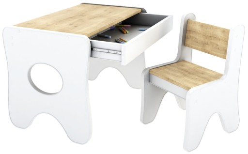 Stolik i krzesełko dla dziecka – oryginalny styl w dziecięcym wnętrzu. Meble dla dzieci zaprojektowane z myślą o bezpieczeństwie, wygodzie i prawidłowym rozwoju najmłodszych. Odpowiednio dobrane krzesełko ze stolikiem to świetny sposób na wykreowanie miejsca, które stanie się bezpieczną przestrzenią dla dzieci. Stolik i krzesełko dla dziecka to fundament zabawy, który uwolni wyobraźnię, tworząc idealne warunki do rozwoju każdego małego artysty. Mebelki wykonane są z certyfikowanych materiałów, wysokiej jakości płyty meblowej laminowanej, wszystkie narożniki są zaokrąglone by użytkowanie mebelków było bezpieczne dla naszych pociech, zaletą jest nowoczesna i bardzo stabilna konstrukcja oraz szuflada pod stolikiem gdzie dziecko może w każdej chwili coś schować albo coś wyjąć by móc bez ograniczeń kreować swoją zabawę.W zależności od potrzeb, stół sprawdzi się do nauki, malowania, zabawy czy spożywania posiłków.