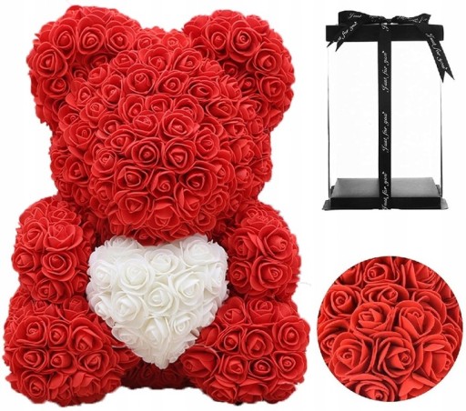 Najmodniejszy w ostatnim czasie prezent, który powstał z myślą o wyjątkowych okazjach. Miś jest pieczołowicie przygotowywany tak aby zaskoczyć najwyższą jakością i stać się luksusowym i ponadczasowy prezentem, dla każdej kobiety. Ten słodki miś wykonany został ze sztucznych, piankowych róż, dzięki czemu nie musisz martwić się o jego trwałość.