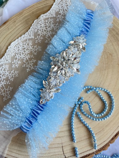 Тюлевая свадебная подвязка СИНИЙ + СЕРЕБРЯНЫЙ ДЕКОРАЦИОН, изготовление на заказ
