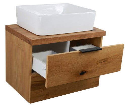 Blat fornirowany naturalnym dębem rustykalnym, powierzchnia obustronnie pokryta olejem w celu zabezpieczenia przed wilgocią. Wykonany z grubej i trwałej płyty (38mm). Idealnie sprawdzi się w każdej łazience jednocześnie nadając jej charakteru. Każdy z blatów ma unikalny układ sęków/słojów.