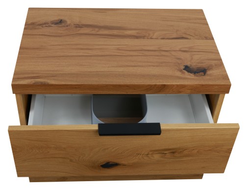 Cała szafka (boki oraz fronty) wykonana z płyty pokrytej naturalnym fornirem dąb rustykalny - dodatkowo lakierowana. Każdy z frontów ma unikalny układ sęków/słojów.