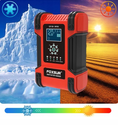 Automatyczne wykrywanie temperatury, Ładowarka automatycznie dostosuje napięcie ładowania do temperatury otoczenia, w pełni ładując zimą i nie przeładowując w lecie.