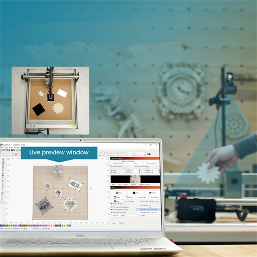 kamera przemysłowa dostosowana do maszyny do grawerowania laserowego, oprogramowanie Lightburn dopasowujące głębokość, po konfiguracji kalibracji może wykonać grawerowanie z badaniem obszaru, automatycznie zlokalizować pozycję przedmiotu do pracy, a błąd pozycjonowania jest mniejszy niż 0.5mm ;