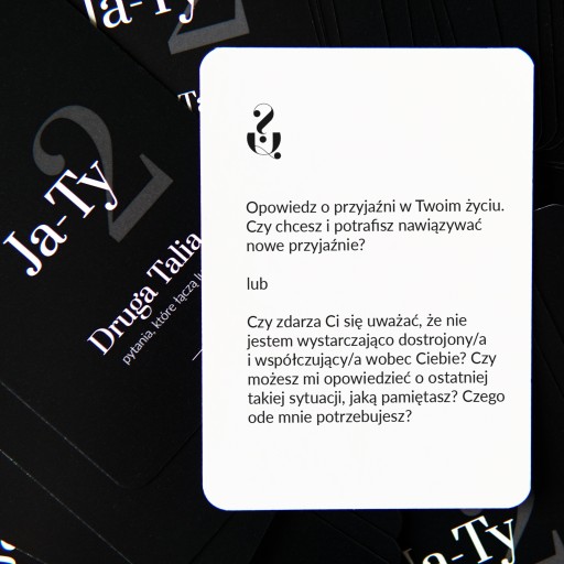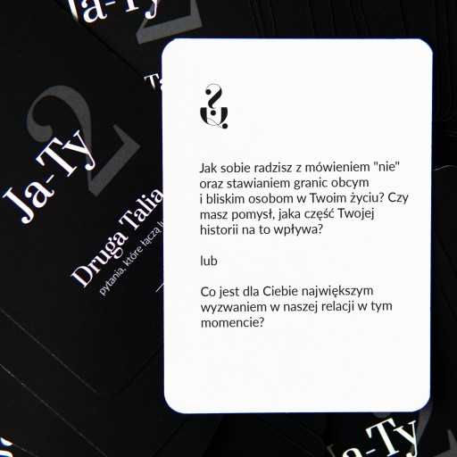 Z Drugiej Talii Ja-Ty można korzystać niezależnie od pierwszej (nie trzeba posiadać Talii Ja-Ty). Talia składa się ze 100 pytań inspirowanych przede wszystkim terapią Gestalt. 50 pytań to (najczęściej otwarte) pytania dotyczące osobistej historii, przekonań i relacji, a pozostałe 50 to pytania relacyjne, dotyczące Twojego związku z osobą/osobami, z którymi grasz.
