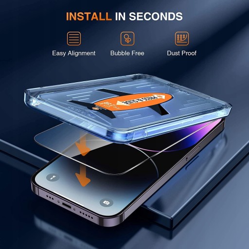 Super łatwy montaż z pomocą pomocy w montażu ramki: łatwy montaż za pomocą filmu instruktażowego. Folię można bardzo łatwo nakleić dzięki dołączonemu elementowi wspomagającemu pozycjonowanie. Folia ochronna do iPhone 14 Pro jest dostarczana z kompletnym zestawem do czyszczenia, aby upewnić się, że w instalacji nie ma pęcherzyków powietrza i kurzu.