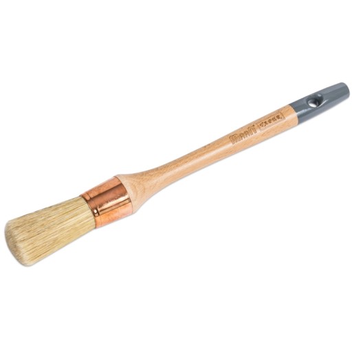 Trzonek pędzla jest wydłużony, wykonany z drewna lakierowanego, z końcówką w kolorze szarym.