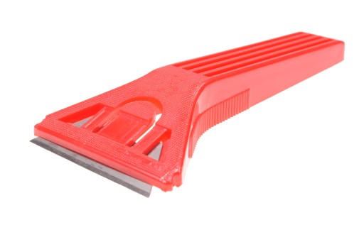 Skrobak do szyb posiada wymienne ostrze trapezowe oraz plastikowy uchwyt z zabezpieczającą osłoną.