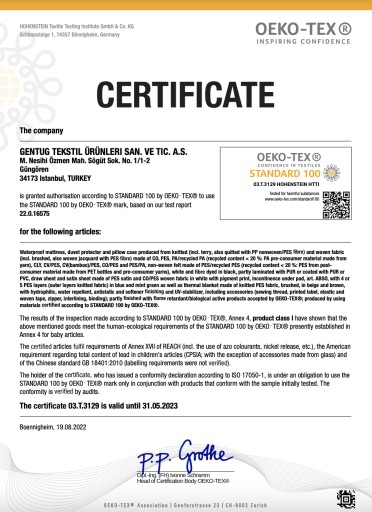 Ochraniacz posiada certyfikaty Oeko-Tex® zapewniające o tym, że wszystkie materiały użyte do jego produkcji są wolne od szkodliwych substancji mających negatywny wpływ na zdrowie. Kupując produkty ze znakiem Oeko-Tex® zyskujesz wysokiej jakości i w 100% bezpieczny materac, który możesz użytkować bez obaw o szkodliwy wpływ na Twoje zdrowie.