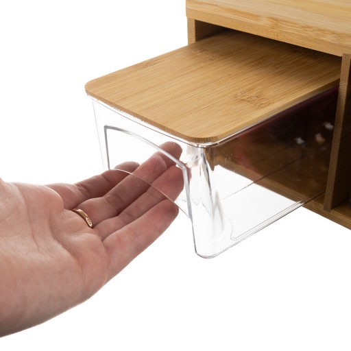 - SPECYFIKACJA - materiał bambus / tworzywo sztuczne / metal; ilość pojemników: 4; ilość tarek: 4; uchwyty do przenoszenia: tak; wymiar pojemnika: 16 x 9 x 7 cm; wymiar całkowity: 40 x 26,5 x 9,5 cm; waga: 2,513 kg; waga w opakowaniu: 2,666 kg.