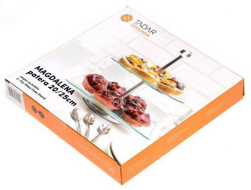Patera Tadar Magdalena to dwa, kwadratowe talerze z wysokiej jakości szkła połączone stalowym stojakiem. Podkreślą one piękno ulubionych słodkości. Efektownie i elegancko podasz ciasta, ciasteczka, babeczki i desery.