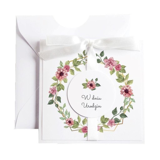 Kartka okolicznościowa na URODZINY - Geometryczny Róż Piękna, ręcznie robiona, składana kartka okolicznościowa z okazji urodzin. OPIS: Napis na kartce - "W dniu Urodzin". Do kartki w komplecie dołączamy białą kopertę z wyciętym otworem na kokardkę ze wstążki oraz dodatkową karteczkę z nadrukowanymi życzeniami (losowo wybierane). Możesz więc wypisać życzenia w kartce samodzielnie lub włożyć/wkleić w środek tę karteczkę. Wymiary kartki: 14 x 14 cm PERSONALIZACJA: Jeśli wolisz gotowe rozwiązania to nadrukujemy przesłany przez Ciebie tekst - wystarczy że zakupisz opcje PERSONALIZACJA KARTEK