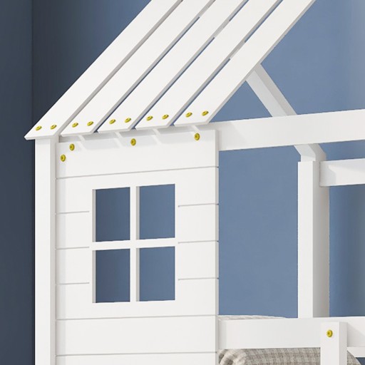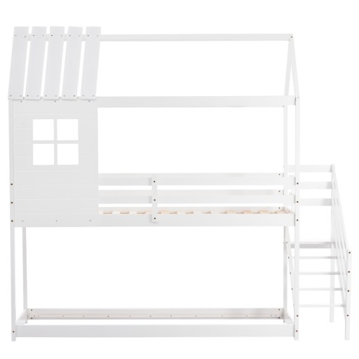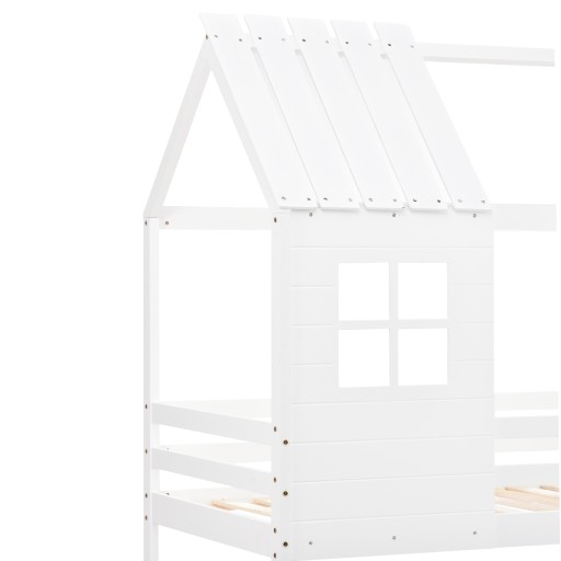 Łóżko piętrowe, łóżko ze schodkami narożnymi, łóżko domek, łóżko dziecięce z zabezpieczeniem przed upadkiem i kratą, z oknem, rama sosna, biały (200x90cm)