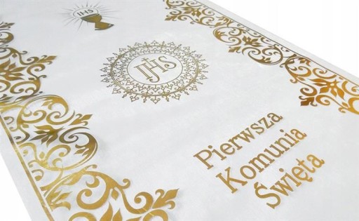 Organza komunijna ze złotym nadrukiem.