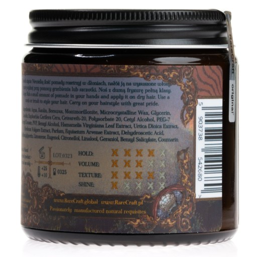 Pomada zawiera bogaty skład naturalnych wyciągów i olejów, które nie tylko modelują włosy, ale również pielęgnują skórę głowy i dbają o kondycję włosów. Oczar wirginijski działa przeciwzapalnie i kojąco na skórę głowy, pomagając w walce z łupieżem i podrażnieniami. Pokrzywa dostarcza włosom niezbędne składniki odżywcze, takie jak witaminy i minerały, które utrzymują ich zdrowie i piękny wygląd. Lanolina to naturalny składnik, który pomaga nawilżyć i zmiękczyć włosy, zapewniając trwały chwyt i kontrolę stylizacji.
