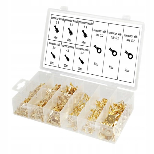 - Konektory kablowe w solidnym plastikowym opakowaniu, posegregowane według rozmiarów w oddzielnych przegródkach.