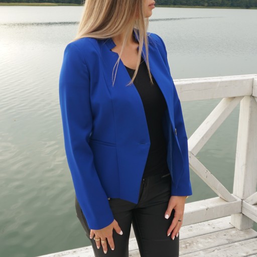 Żakiet klasyczny ze stójką w kolorze chabrowym.