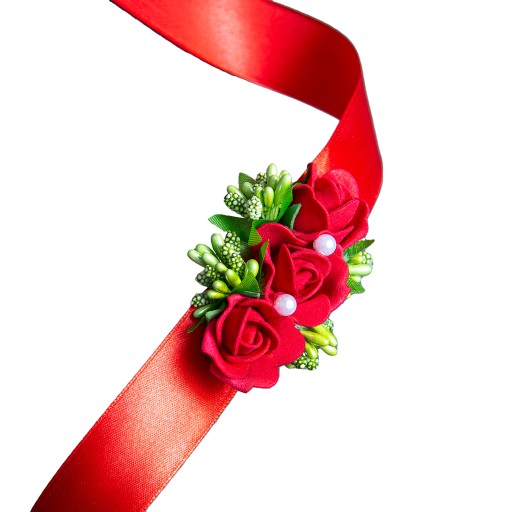 Bukieciki wykonane na efektownej szerokiej wstążce do zawiązania na rękę.