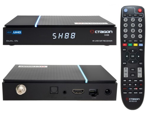 Najnowsza wersja (V2) znanego i cenionego odbiornika Octagon SX88. Tym razem to odbiornik 4K z podwójnym systemem operacyjnym (Dual OS): klasycznym znanym z modeli SX88 Define OS oraz Linux typu ENIGMA2. Ten drugi dzięki oprogramowaniu OpenATV 7.2 daje użytkownikowi jak zwykle w takim przypadku nieograniczone możliwości oparte na dodatkowych rozszerzeniach, wtyczkach, które można pobierać z Internetu. Sercem odbiornika jest procesor Huawei Hisilicon Hi3798MV300 taktowany zegarem 4x1500 MHz. Posiada 4GB pamięci Flash i 1GB pamięci RAM. Ma jedno wejście SAT do podłączenia anteny satelitarnej, 2 wejście USB, gniazdo LAN do podłączenia do Internetu i Uniwersalny czytnik kart.