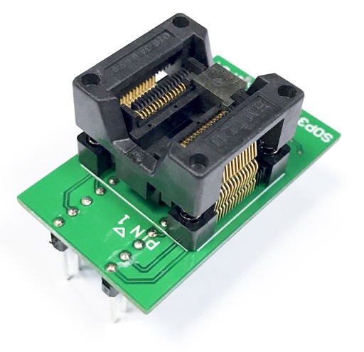 Zastosowana profesjonalna podstawka ZIF firmy Enplas / HMILU (OTS-28(34)-0.65-01) z systemem dual clamp chwyta wyprowadzenia układu zarówno z góry jak i z dołu (a nie tylko z dołu jak tańsze podstawki) - co zapewnia lepszy kontakt z układem.